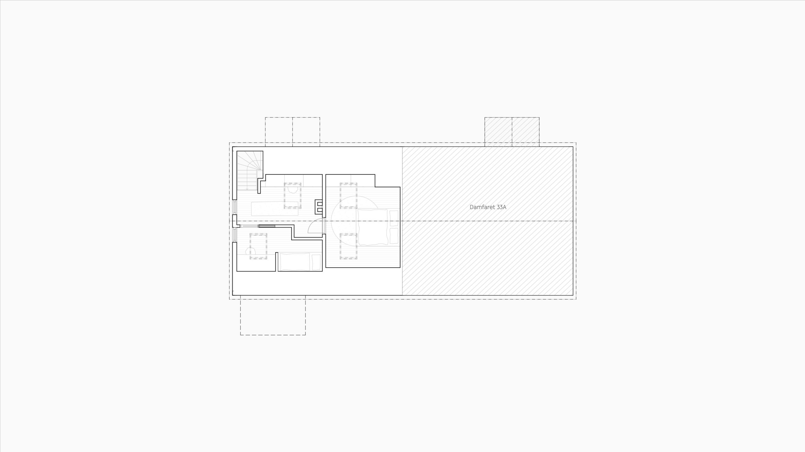 Ny planløsning til loft i en del av en tomannsbolig på Godlia i Oslo. Trang situasjon, med sentralt plassert pipe. Etablert nytt hovedsoverom, barnerom samt en liten kontorplass med overlys fra takvindu.