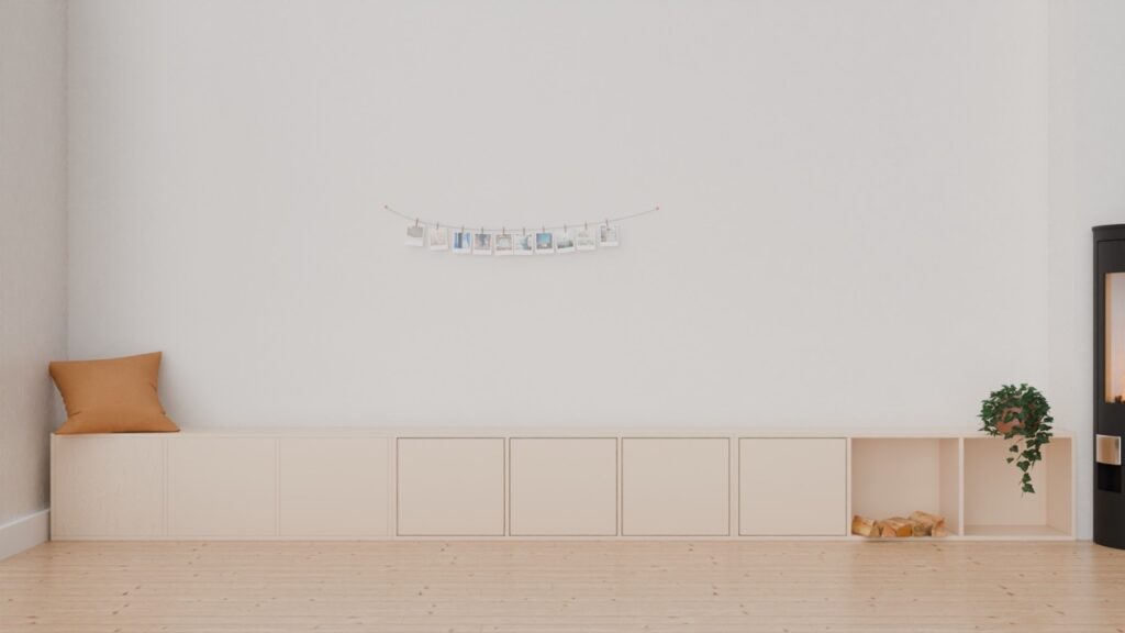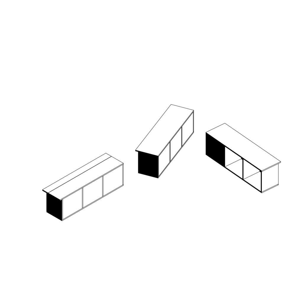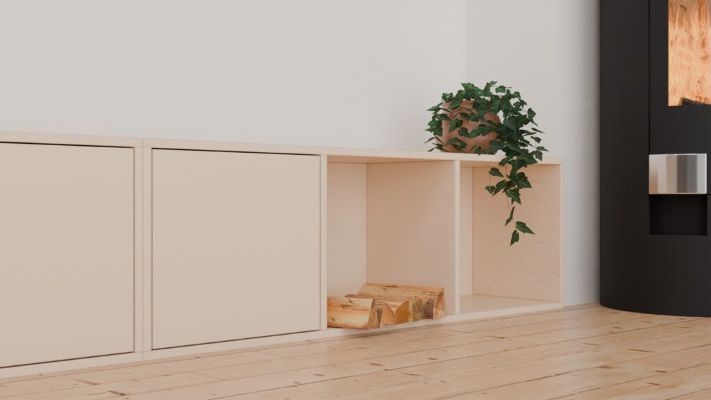 Plassbygget benk, i tre moduler. Alle modulene har forskjellige oppbevaringsløsninger. Tegnet og bygget av meg, i kryssfiner av bjørk, levert av Oslofinér.